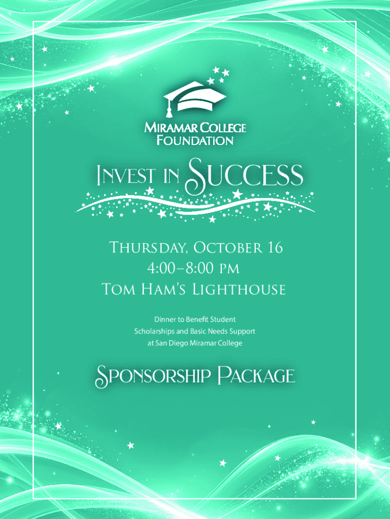 Invest in Success Thursday, October 16 4:00 8:00 pm Tom Hams Lighthouse Dinner to Benefit Student Scholarships and Basic Needs Support at San Diego Miramar CollegeFoundation Board: Rene McKee, President
