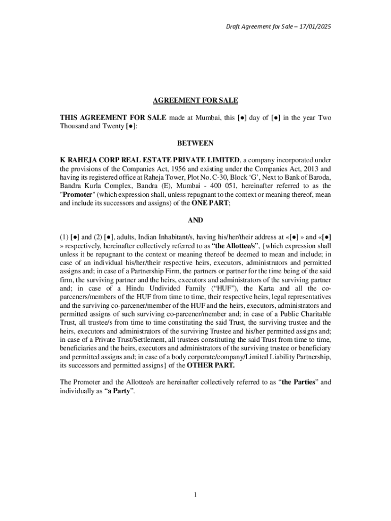 An agreement for sale is a legally binding contract between a buyer and a seller, detailing the terms and conditions under which a property will be sold. This document is essential in real estate transactions as it serves to protect the interests of both parties. By clearly outlining the responsibilities and rights of each party, the agreement minimizes the risk of misunderstandings and disputes.