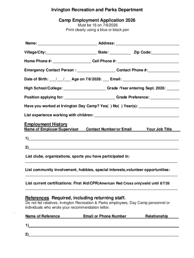 Get the free Irvington Recreation and Parks Department Camp Employment ...