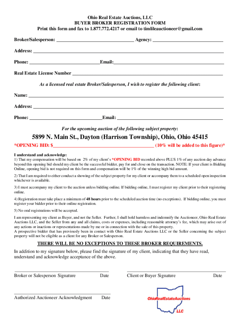 Ohio Real Estate Auctions, LLC BUYER BROKER REGISTRATION FORM Print this form and fax to 1.877.772.4217 or email to timlileauctioneer@gmail.com Broker/Salesperson: ___ Agency: ___ Address: ___ Phone: