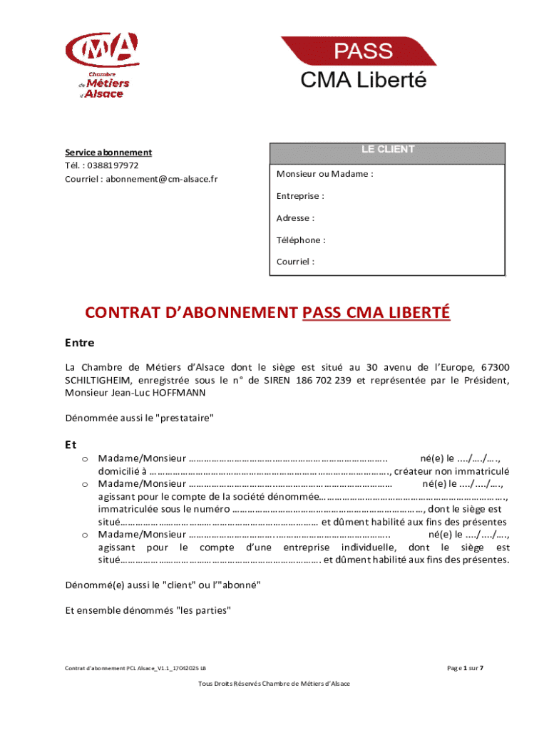 Obtenir le gratuit CONTRAT D'ABONNEMENT PASS CMA LIBERT