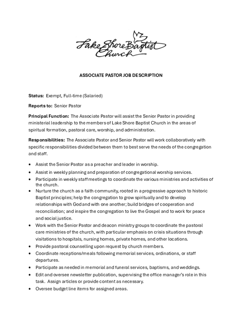 The effectiveness of an associate pastor job description significantly hinges on how well it aligns with the specific culture and needs of your church. Understanding the mission of your congregation is essential when crafting the job description, ensuring that it resonates with potential candidates who share your vision.
