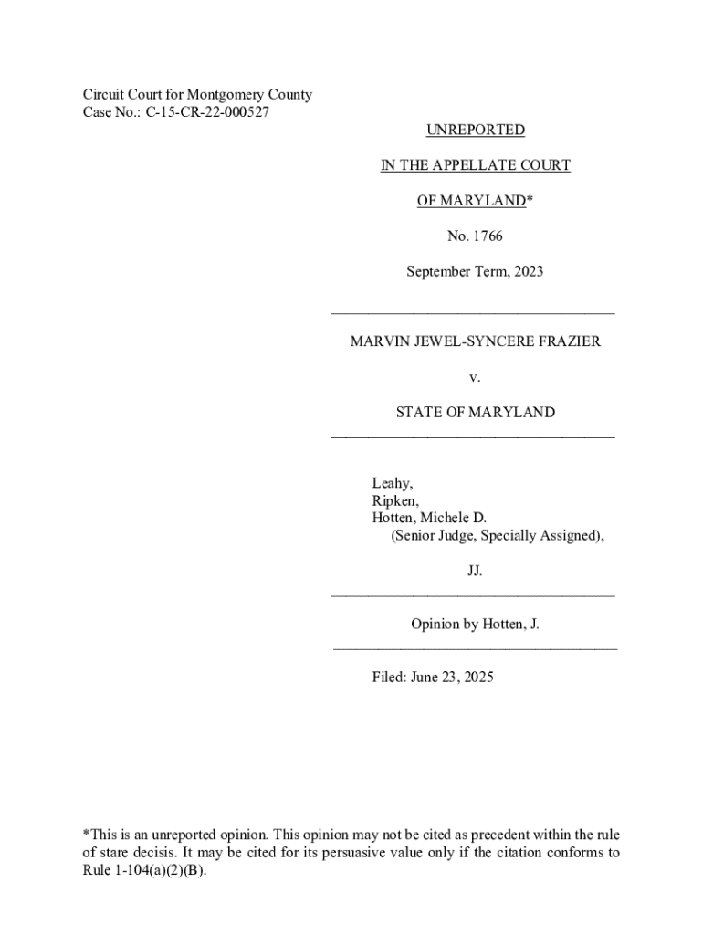 Circuit Court for Montgomery County Case No.: C15CR22000527UNREPORTED IN THE APPELLATE COURT OF MARYLAND* No. 1766 September Term, 2023 ___ MARVIN JEWELSYNCERE FRAZIER v. STATE OF MARYLAND ___ Leahy,