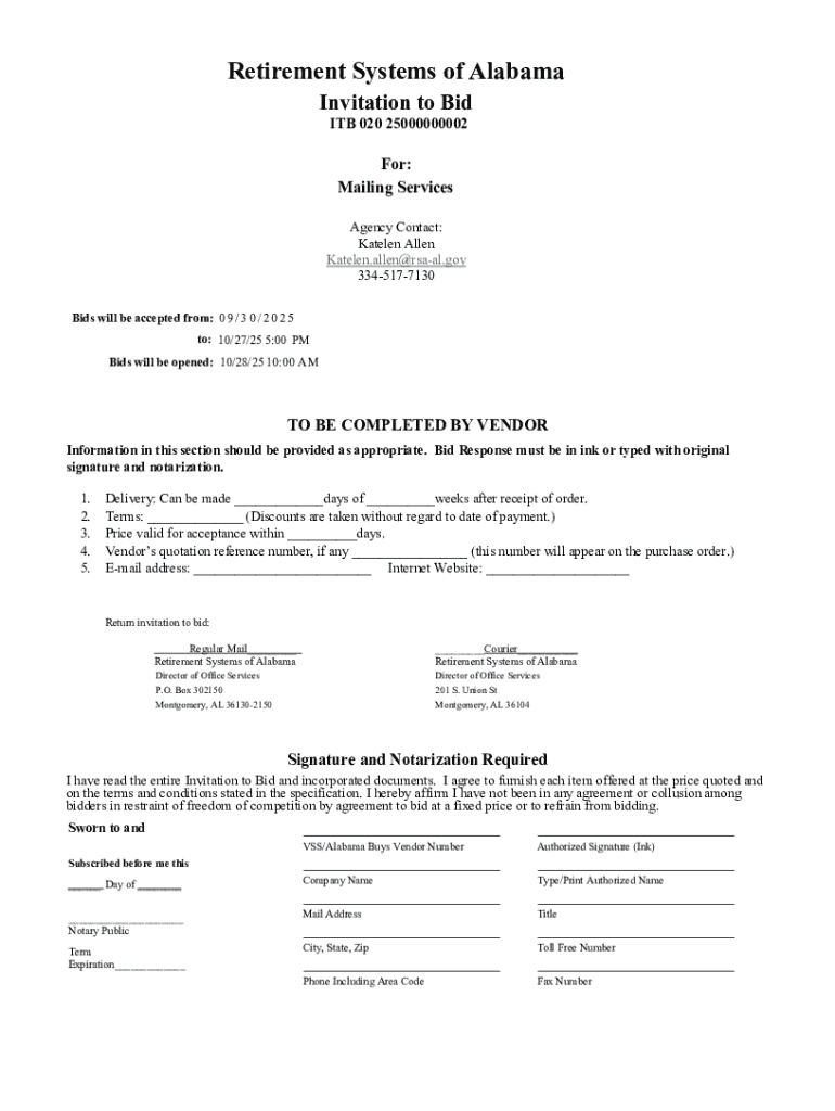 Retirement Systems of Alabama Invitation to Bid ITB 020 25000000002For: Mailing Services Agency Contact: Katelen Allen Katelen.allen@rsaal.gov 3345177130 Bids will be accepted from: 0 9 / 3 0 / 2