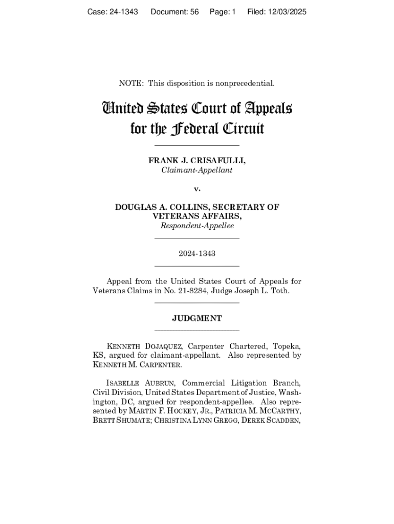 Case: 241343Document: 56Page: 1Filed: 12/03/2025NOTE: This disposition is nonprecedential.United States Court of Appeals for the Federal Circuit ___ FRANK J. CRISAFULLI, ClaimantAppellant v. DOUGLAS