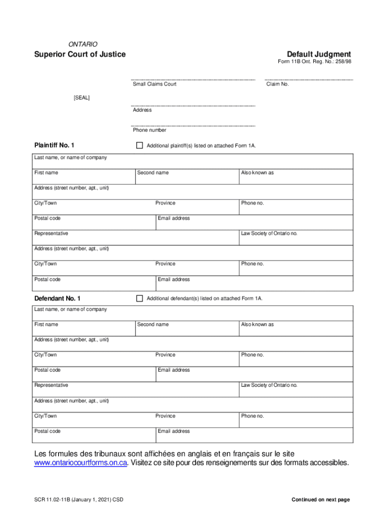 The Ontario Superior Court Default Judgment Form 11B is a legal document used by plaintiffs in Ontario Small Claims Court to obtain a default judgment against a non-responsive defendant.