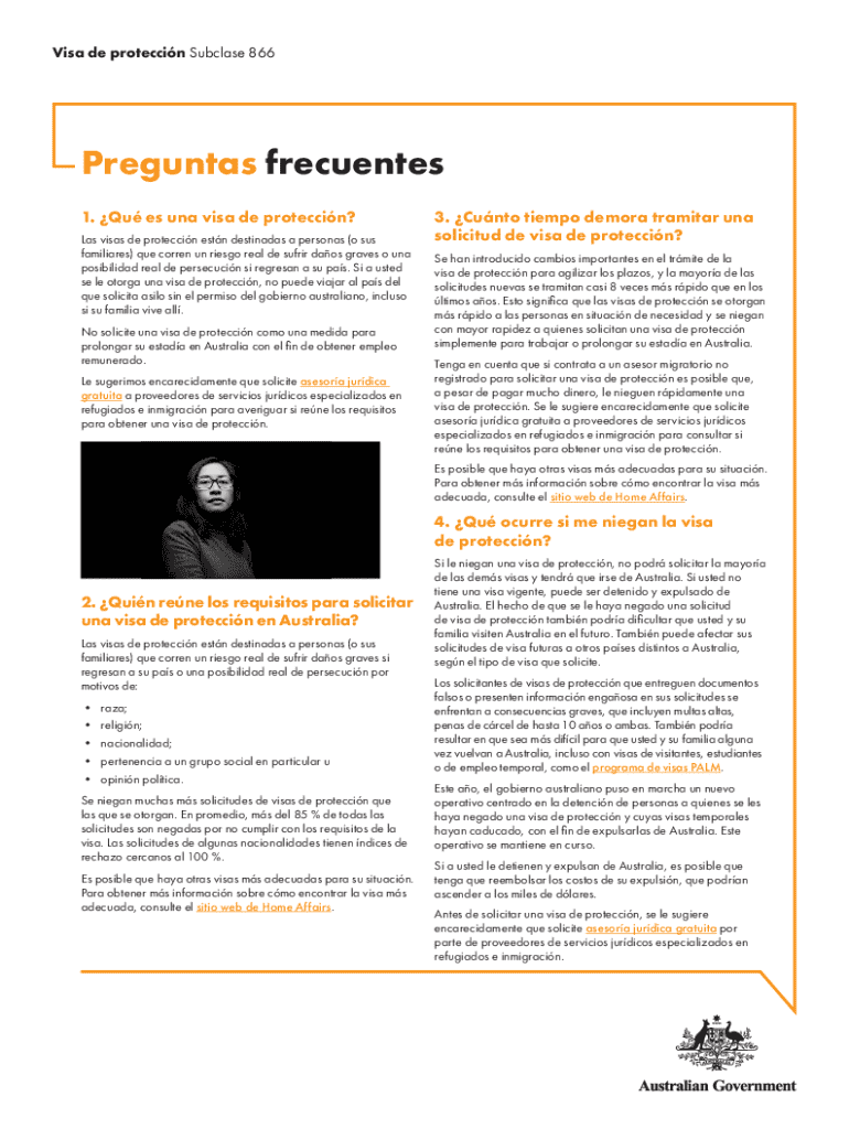 Visa de proteccin Subclase 866Preguntas frecuentes 1. Qu es una visa de proteccin? Las visas de proteccin estn destinadas a personas (o sus familiares) que corren un riesgo real de sufrir daos graves