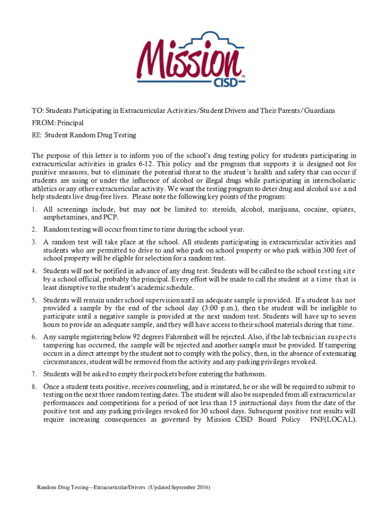 TO: Students Participating in Extracurricular Activities/Student Drivers and Their Parents/Guardians FROM: Principal RE: Student Random Drug Testing The purpose of this letter is to inform you of