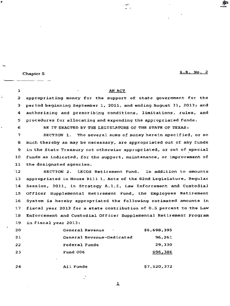 . .\"....\'\"S. B. No.2Chapter 5 \'. ,,1AN ACT2appropriating money for the support of state government for the3period beginning September 1, 2011, and ending August 31, 2013; and4authorizing and prescribing