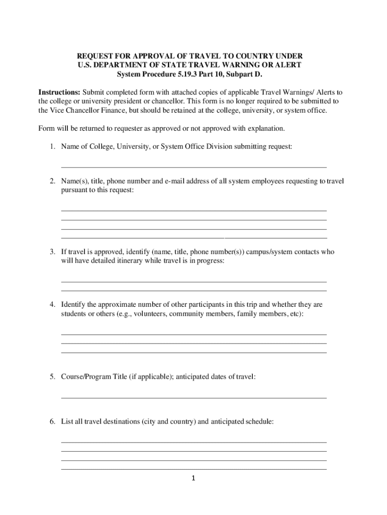 REQUEST FOR APPROVAL OF TRAVEL TO COUNTRY UNDER U.S. DEPARTMENT OF STATE TRAVEL WARNING OR ALERT System Procedure 5.19.3 Part 10, Subpart D. Instructions: Submit completed form with attached copies