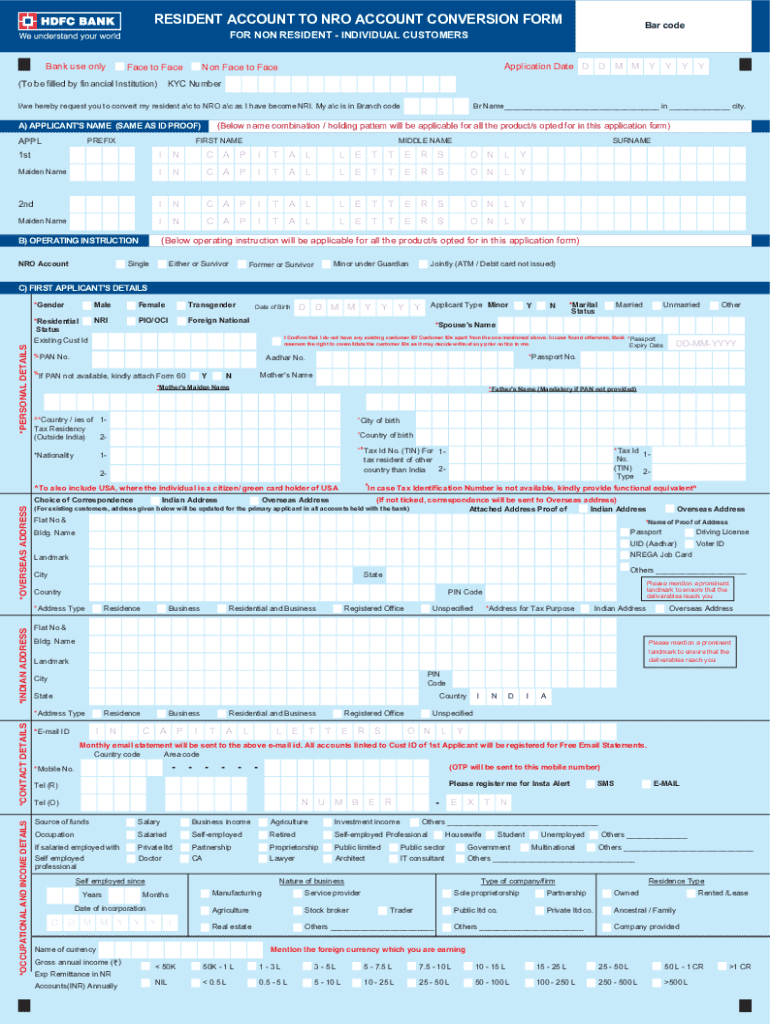 RESIDENT ACCOUNT TO NRO ACCOUNT CONVERSION FORMBar codeFOR NON RESIDENTINDIVIDUAL CUSTOMERSBank use onlyFace to Face(To be filled by financial Institution)Application Date DNon Face to FaceI/we hereby