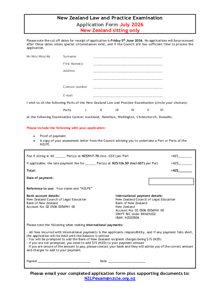 New Zealand Law and Practice Examination Application Form July 2026 New Zealand sitting only Please note the cut off dates for receipt of application is Friday 5th June 2026. No applications will