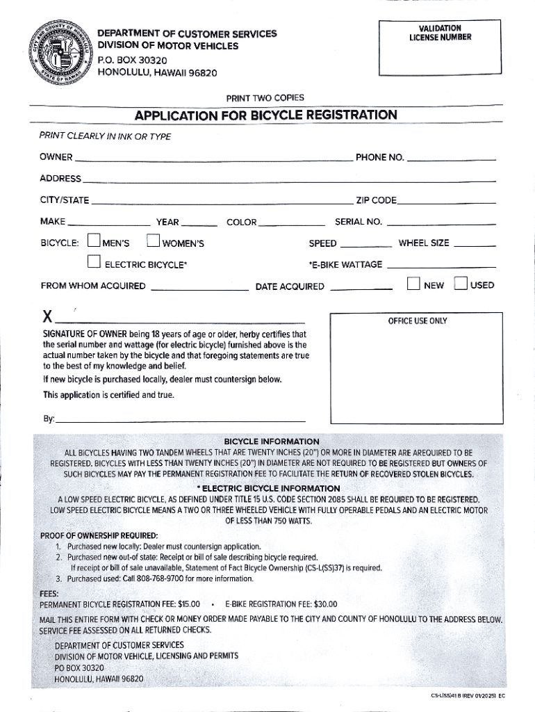 VALIDATION LICENSE NUMBERDEPARTMENT OF CUSTOMER SERVICES DIVISION OF MOTOR VEHICLES* P.O. BOX 30320 HONOLULU, HAWAII 96820 PRINT TWO COPIESAPPLICATION FOR BICYCLE REGISTRATION PRINT CLEARLY IN INK