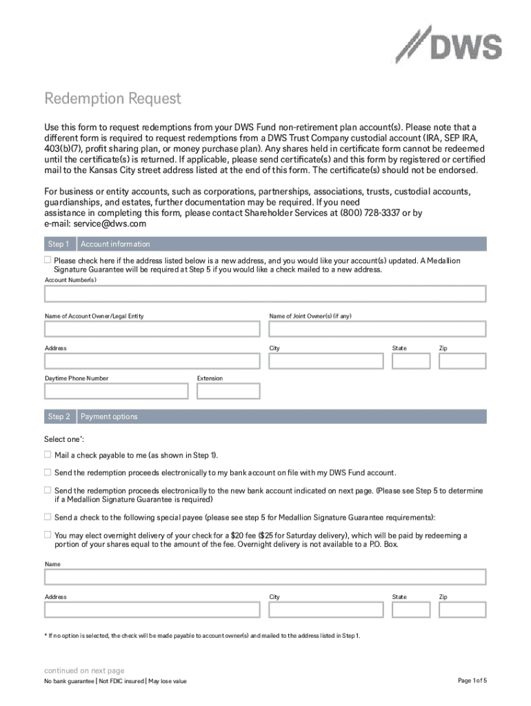 Get the free different form is required to request redemptions from a DWS Trust Company custodial...