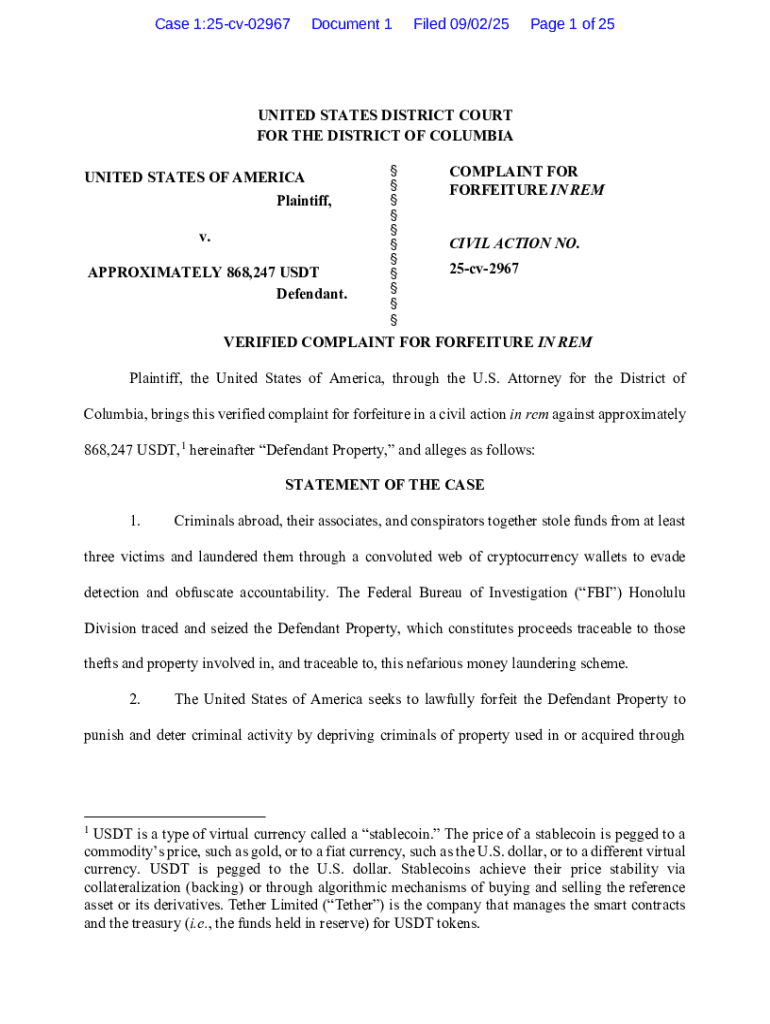Case 1:25cv02967Document 1Filed 09/02/25Page 1 of 25UNITED STATES DISTRICT COURT FOR THE DISTRICT OF COLUMBIA UNITED STATES OF AMERICA Plaintiff, v. APPROXIMATELY 868,247 USDT Defendant.\' \' \' \'