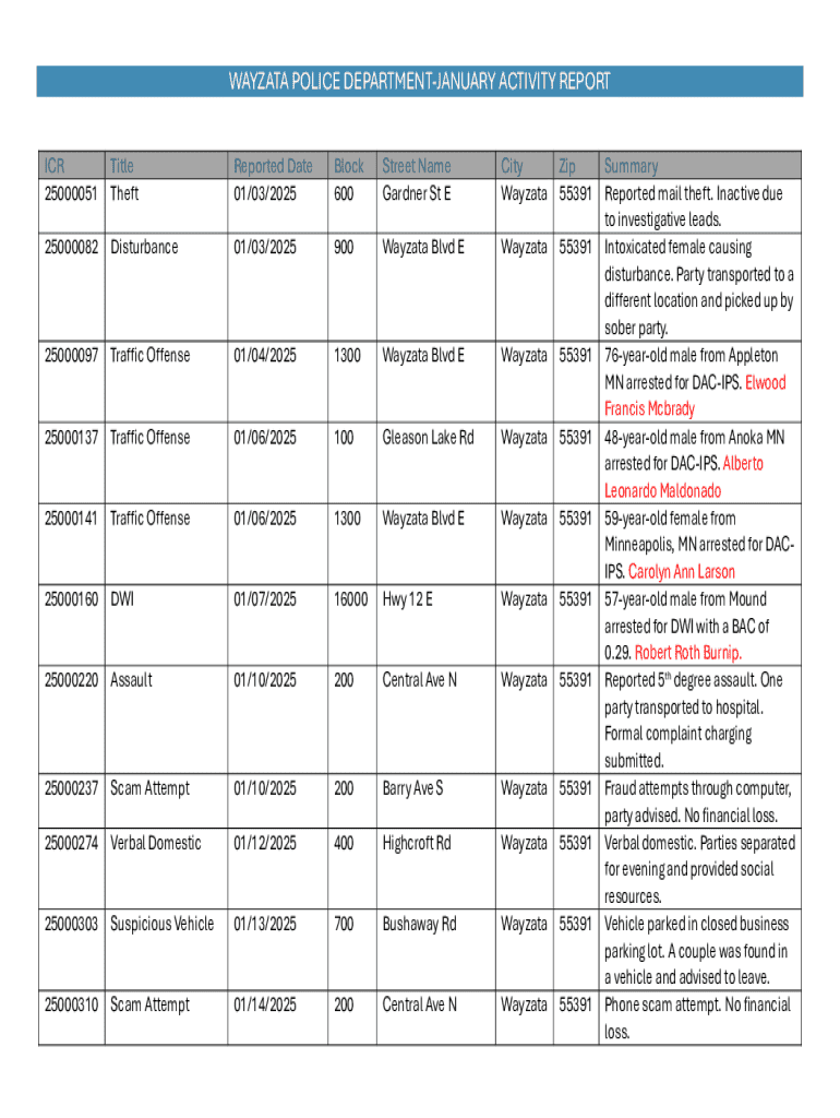 Ultimately, by focusing on community feedback regarding the January Activity Form, the Wayzata Police Department strives to create a responsive and reputable police force dedicated to serving the needs of those who live in and around Lake Minnetonka, ensuring cohesive and safe neighborhoods.