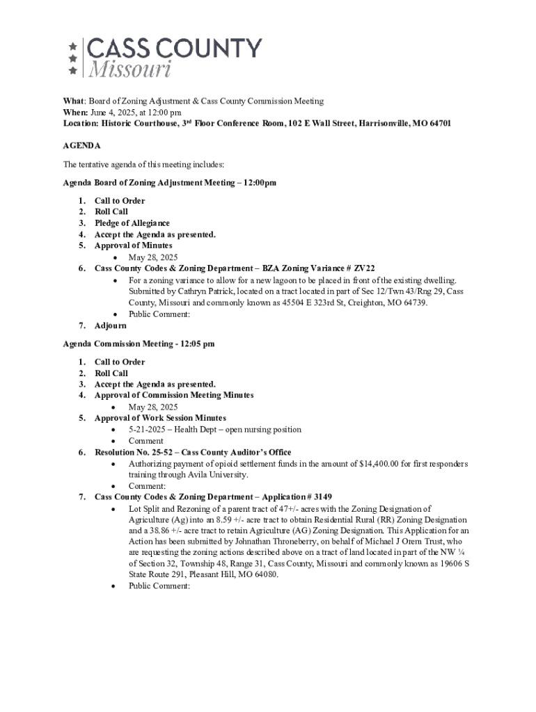 What: Board of Zoning Adjustment & Cass County Commission Meeting When: June 4, 2025, at 12:00 pm Location: Historic Courthouse, 3rd Floor Conference Room, 102 E Wall Street, Harrisonville, MO 64701