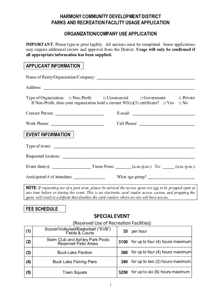 HARMONY COMMUNITY DEVELOPMENT DISTRICT PARKS AND RECREATION FACILITY USAGE APPLICATION ORGANIZATION/COMPANY USE APPLICATION IMPORTANT: Please type or print legibly. All sections must be completed.