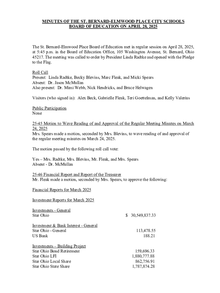 MINUTES OF THE ST. BERNARDELMWOOD PLACE CITY SCHOOLS BOARD OF EDUCATION ON APRIL 28, 2025The St. BernardElmwood Place Board of Education met in regular session on April 28, 2025, at 5:45 p.m. in the