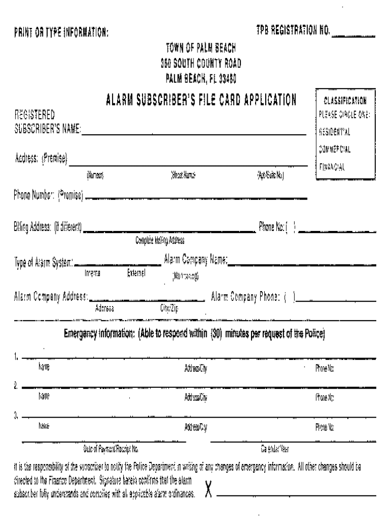 TPB REGISTRATION NO. _ _ _ __PRINT OR TYPE INFORMATION: TOWN OF PALM BEACH 360 SOUTH COUNTY ROAD PALM BEACH, FL 33480ALARM SUBSCRIBER\'S FILE CARD APPLICATIONCLASSIFICATIONREGISTERED SUBSCRIBER\'S