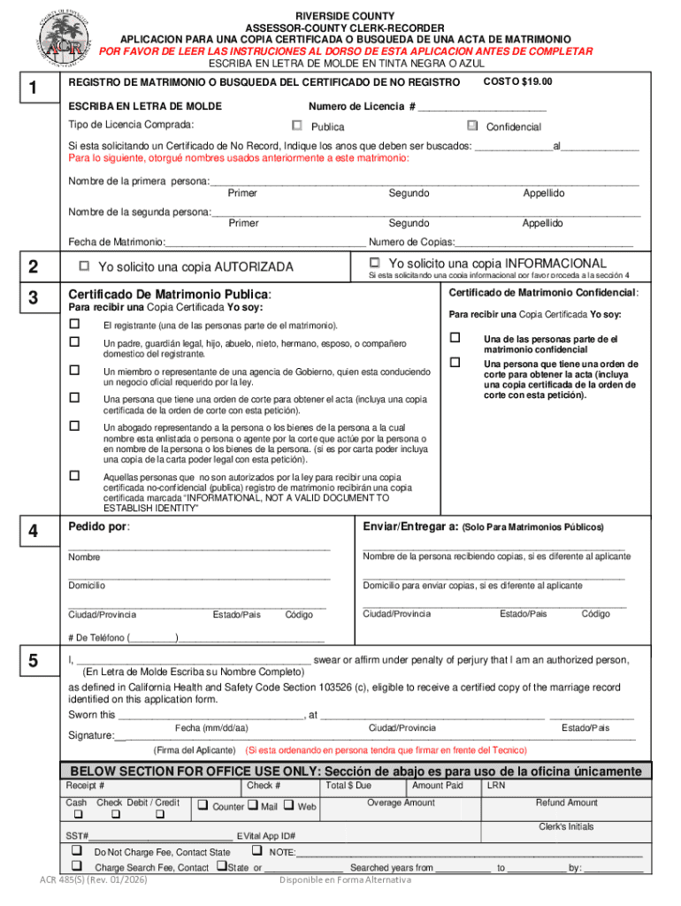 RIVERSIDE COUNTY ASSESSORCOUNTY CLERKRECORDER APLICACION PARA UNA COPIA CERTIFICADA O BUSQUEDA DE UNA ACTA DE MATRIMONIO POR FAVOR DE LEER LAS INSTRUCIONES AL DORSO DE ESTA APLICACION ANTES DE COMPLETAR