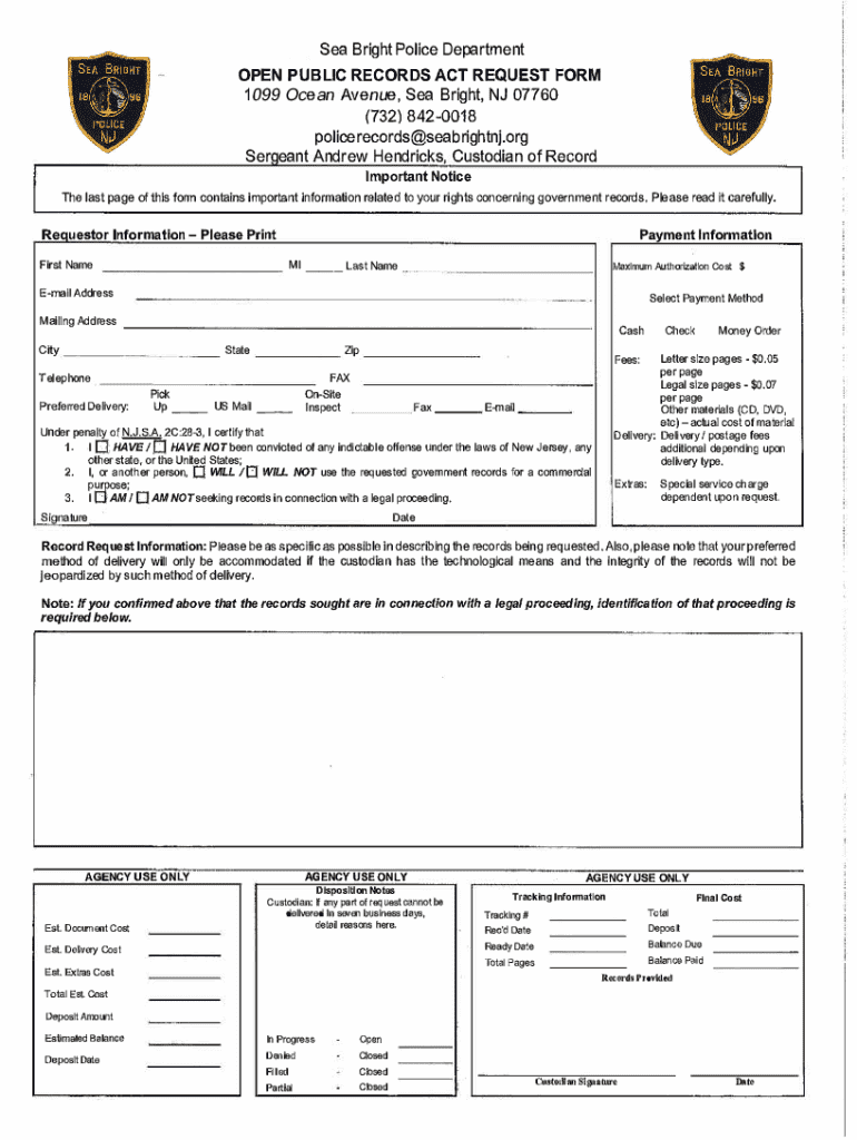 Get the free Sea Bright Police Department Open Public Records Act Request Form