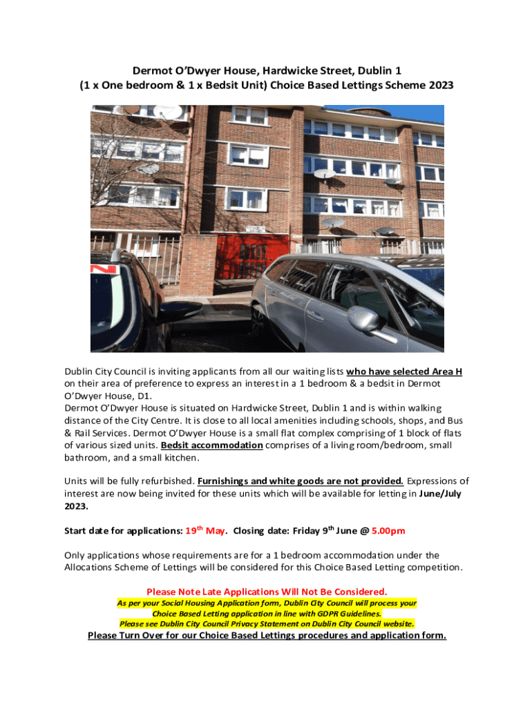 Dermot ODwyer House, Hardwicke Street, Dublin 1 (1 x One bedroom & 1 x Bedsit Unit) Choice Based Lettings Scheme 2023Dublin City Council is inviting applicants from all our waiting lists who have