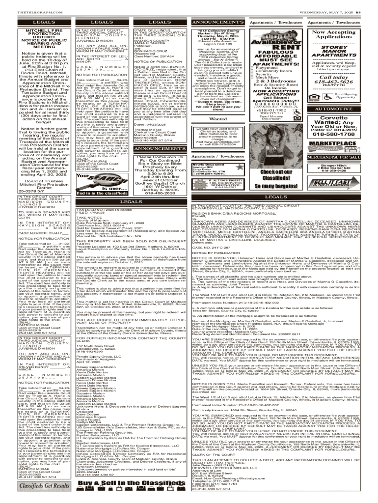 THETELEGRAPH.COMWEDNESDAY, MAY 7, 2025 B3LEGALSLEGALSLEGALSANNOUNCEMENTSMITCHELL FIRE PROTECTION DISTRICT NOTICE OF PUBLIC HEARING AND MEETINGIN THE CIRCUIT COURT THIRD JUDICIAL CIRCUIT MADISON COUNTY,