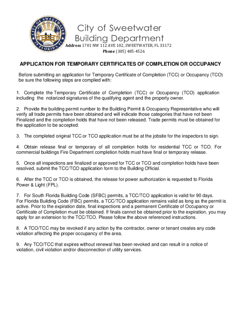 City of Sweetwater Building DepartmentAddress 1701 NW 112 AVE 102, SWEETWATER, FL 33172 Phone (305) 4854526APPLICATION FOR TEMPORARY CERTIFICATES OF COMPLETION OR OCCUPANCY Before submitting an application