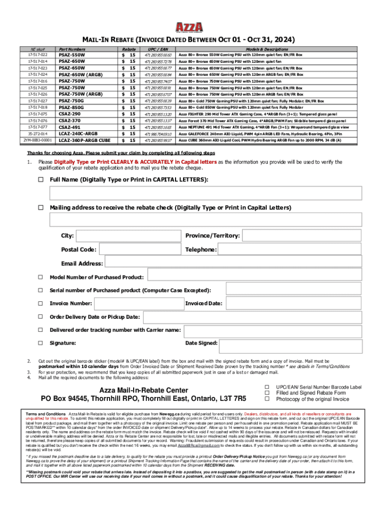 MAILIN REBATE (INVOICE DATED BETWEEN OCT 01OCT 31, 2024) NE sku#Part NumbersRebate17517022PSAZ550W PSAZ650W PSAZ650W PSAZ650W (ARGB) PSAZ750W PSAZ750W PSAZ750W (ARGB) PSAZ750G PSAZ850G CSAZ290 CSAZ370