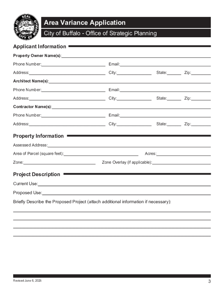 To fill out an area variance application, applicants must provide accurate property details, the specific zoning requirements they wish to vary from, an explanation of the hardship justifying the variance, and any required supporting documents or plans.