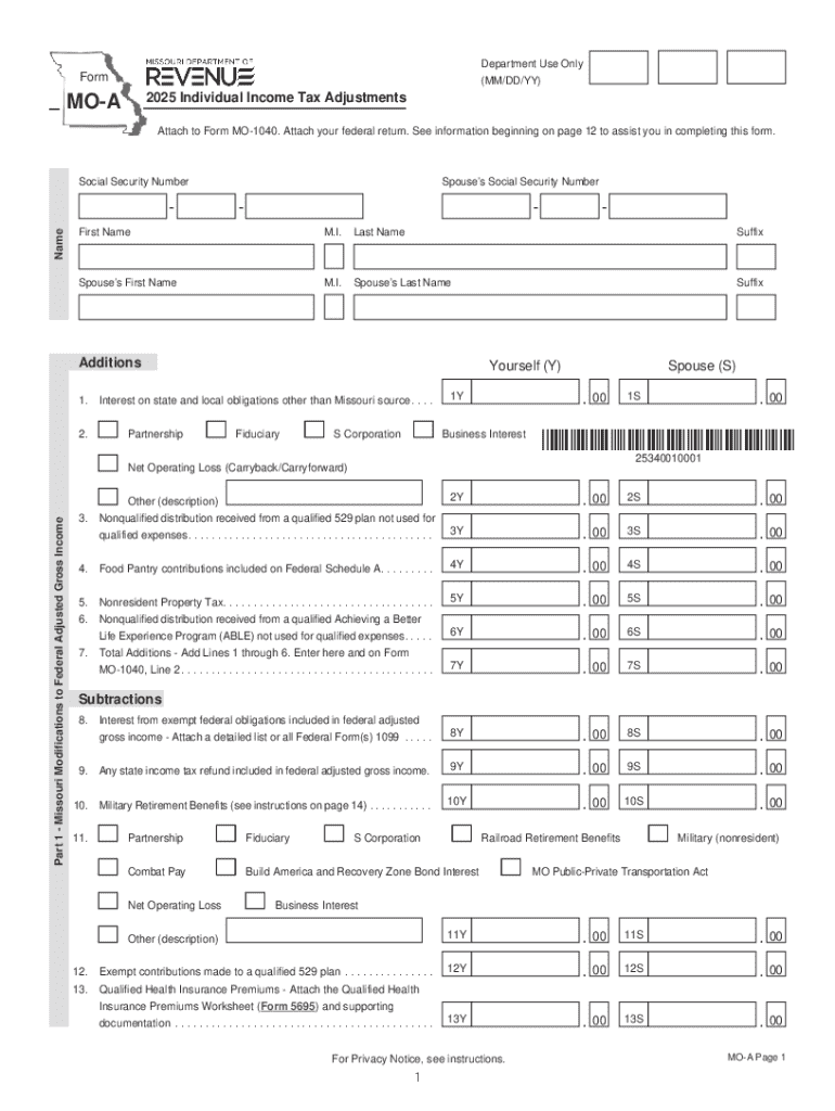 Form MO-A is a tax form specific to the state of Missouri, utilized by residents to report their income and calculate their state tax obligations. Understanding this form is crucial, especially for the tax year 2025, as it dictates how various income types and deductions are applied to determine liabilities. As tax season approaches, ensuring accurate completion of Form MO-A can significantly affect tax return outcomes.