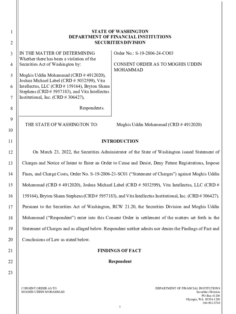 STATE OF WASHINGTON DEPARTMENT OF FINANCIAL INSTITUTIONS SECURITIES DIVISION1 2 3 4 5 6 7IN THE MATTER OF DETERMINING Whether there has been a violation of the Securities Act of Washington by: Moghis