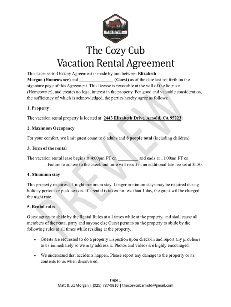 Get the free The Cozy Cub Vacation Rental Agreement
