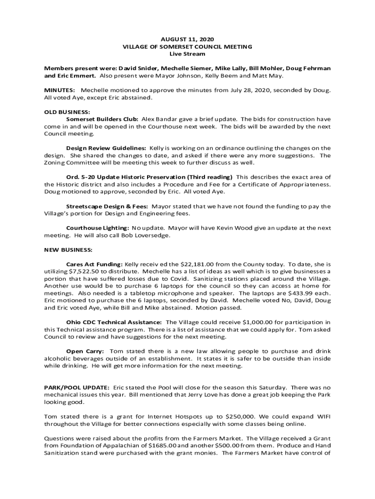 AUGUST 11, 2020 VILLAGE OF SOMERSET COUNCIL MEETING Live Stream Members present were: David Snider, Mechelle Siemer, Mike Lally, Bill Mohler, Doug Fehrman and Eric Emmert. Also present were Mayor