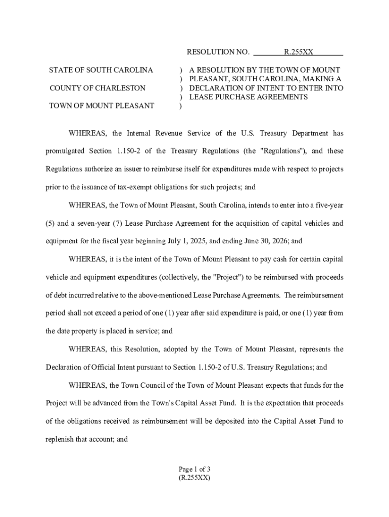 RESOLUTION NO. STATE OF SOUTH CAROLINA COUNTY OF CHARLESTON TOWN OF MOUNT PLEASANT) ) ) ) )R.255XXA RESOLUTION BY THE TOWN OF MOUNT PLEASANT, SOUTH CAROLINA, MAKING A DECLARATION OF INTENT TO ENTER