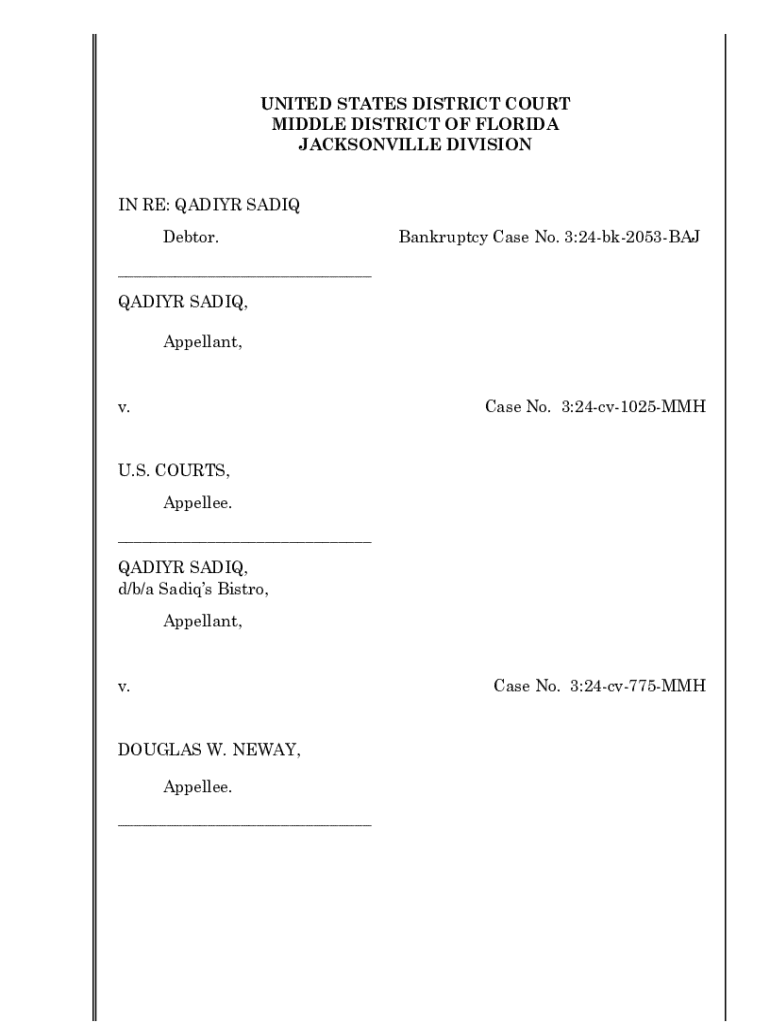 UNITED STATES DISTRICT COURT MIDDLE DISTRICT OF FLORIDA JACKSONVILLE DIVISION IN RE: QADIYR SADIQ Debtor.Bankruptcy Case No. 3:24bk2053BAJ___ QADIYR SADIQ, Appellant, v.Case No. 3:24cv1025MMHU.S.
