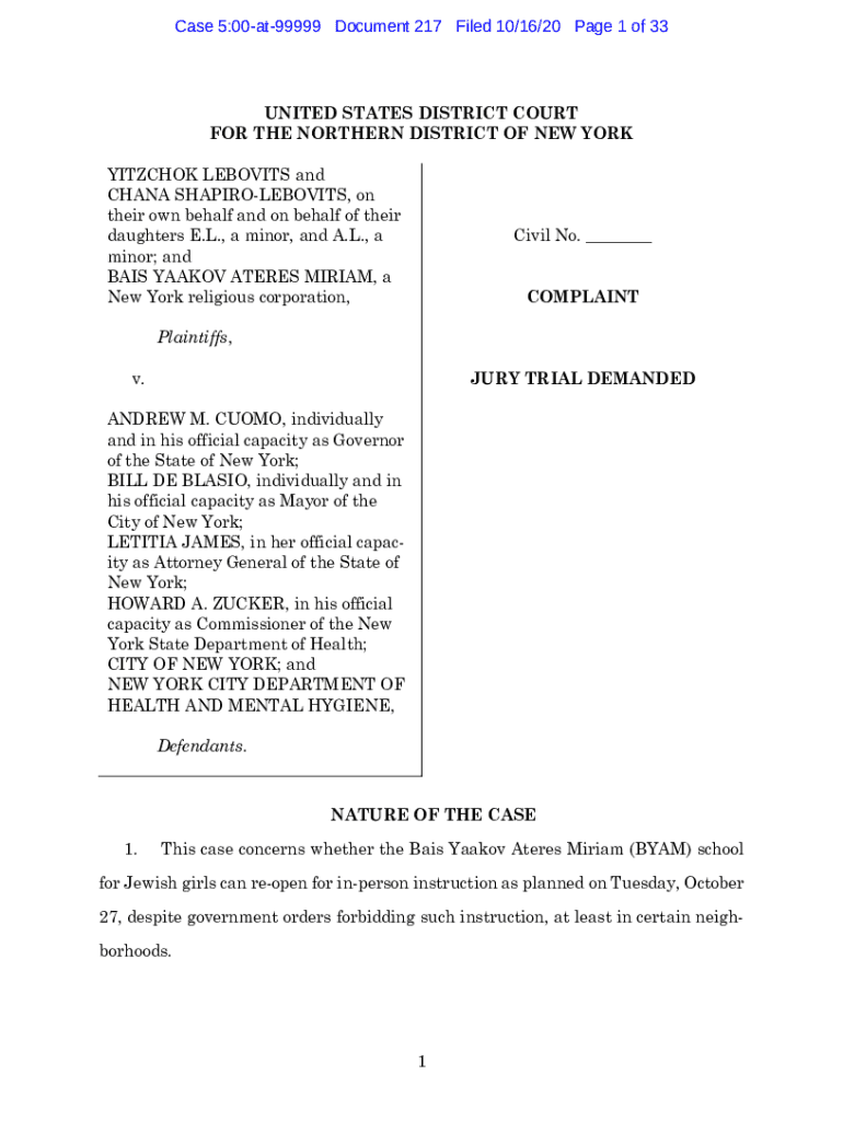Case 5:00at99999 Document 217 Filed 10/16/20 Page 1 of 33UNITED STATES DISTRICT COURT FOR THE NORTHERN DISTRICT OF NEW YORK YITZCHOK LEBOVITS and CHANA SHAPIROLEBOVITS, on their own behalf and on
