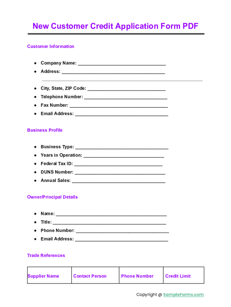 A new customer credit application form is a crucial document that business owners use to evaluate the creditworthiness of potential customers. This form goes beyond just collecting basic information; it helps businesses mitigate risks associated with lending or extending credit to new clients. A well-structured credit application provides insights into a customer's financial situation, payment history, and business authority, serving both the applicant and the lender by ensuring a transparent credit assessment process.