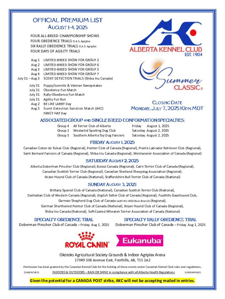 FOUR ALLBREED CHAMPIONSHIP SHOWS FOUR OBEDIENCE TRIALS O.A.S. Agriplex SIX RALLY OBEDIENCE TRIALS O.A.S. Agriplex FOUR DAYS OF AGILITY TRIALS Aug 1 Aug 2 Aug 3 Aug 4 July 31Aug 3 July 31 July 31 July