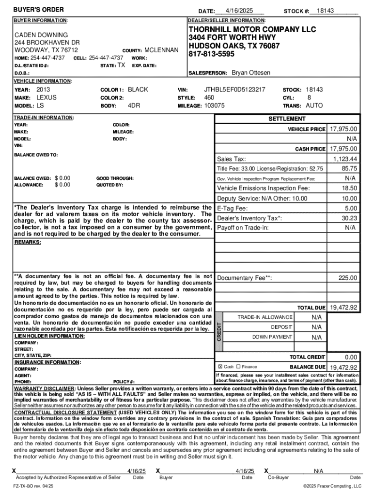 BUYER\'S BUYERS ORDER4/16/2025 DATE:___18143 STOCK #:___BUYER INFORMATION:DEALER/SELLER INFORMATION:CADEN DOWNING 244 BROOKHAVEN DR WOODWAY, TX 76712THORNHILL MOTOR COMPANY LLC 3404 FORT WORTH HWY