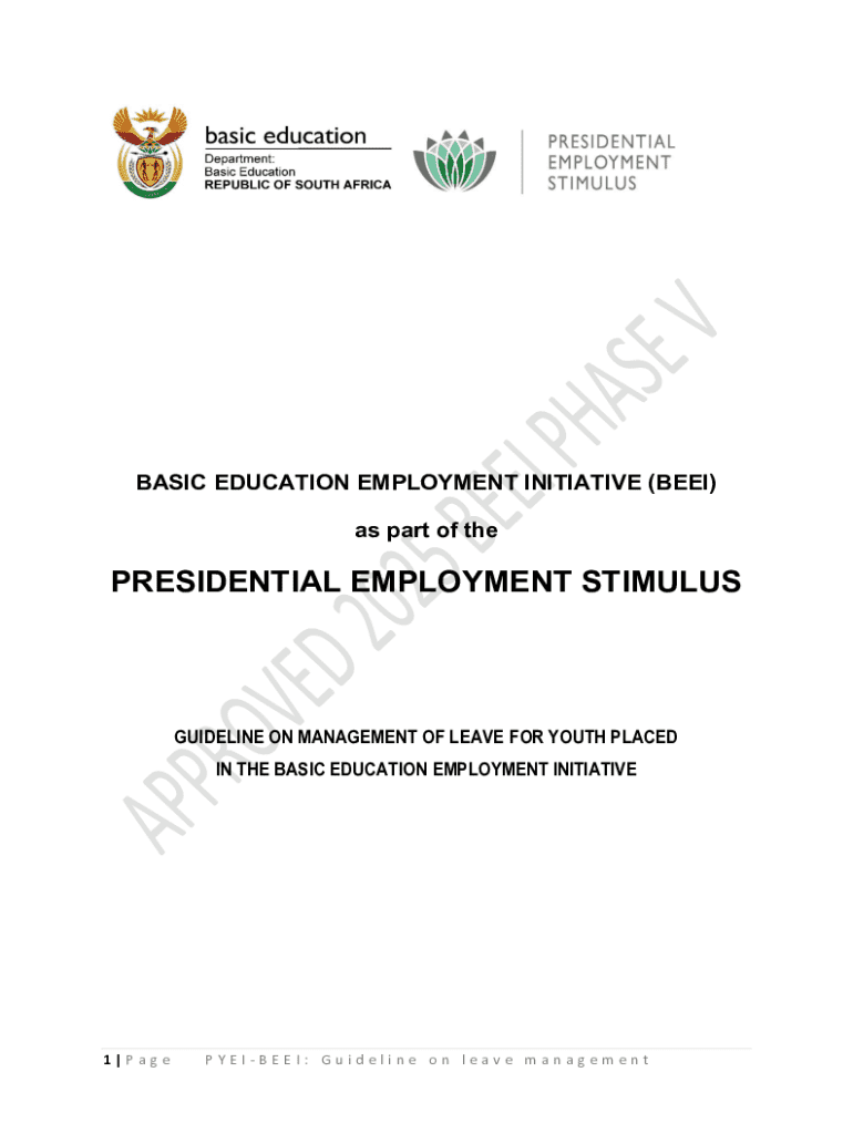 BASIC EDUCATION EMPLOYMENT INITIATIVE (BEEI) as part of thePRESIDENTIAL EMPLOYMENT STIMULUSGUIDELINE ON MANAGEMENT OF LEAVE FOR YOUTH PLACED IN THE BASIC EDUCATION EMPLOYMENT INITIATIVE1|PagePYEIBEEI: