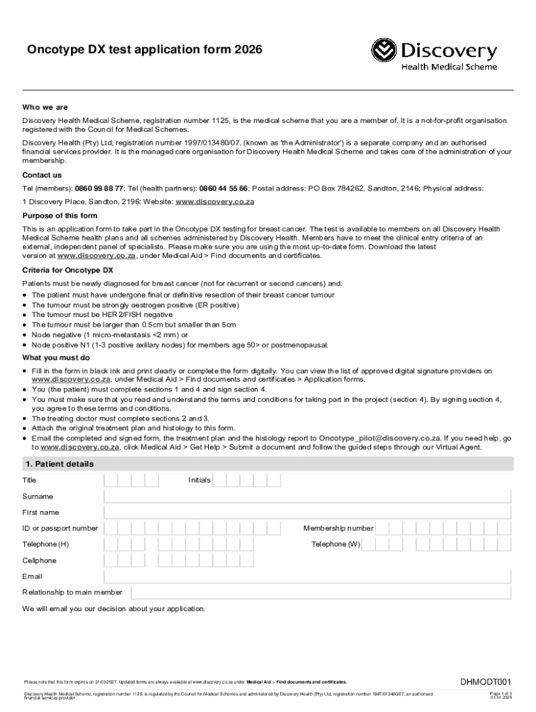 The Oncotype DX Test Application Form 2026 is a medical consent document used by patients and their treating doctors to apply for Oncotype DX testing for early-stage breast cancer.