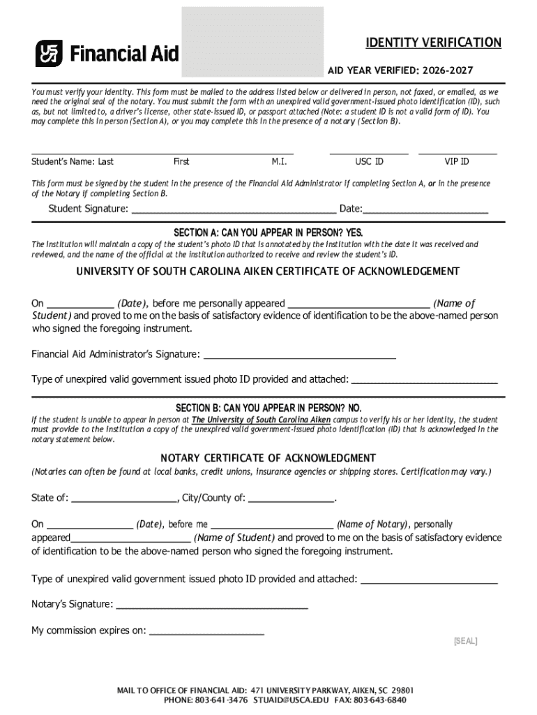 The Identity Verification Form is essential for students at the University of South Carolina Aiken, serving as a means to verify their identity for financial aid purposes. It plays a critical role in the financial aid process by ensuring that students meet specific verification requirements. The importance of submitting this form cannot be overstated, as it directly impacts the ability of students to receive the necessary financial assistance.