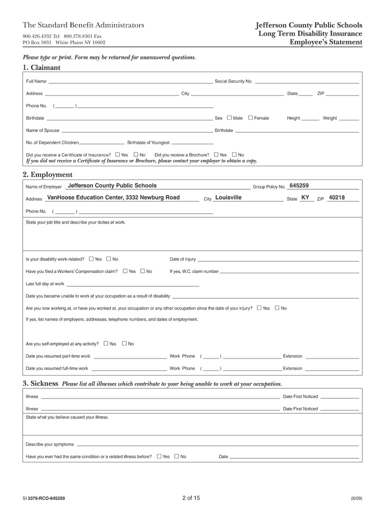 Jefferson County Public Schools Long Term Disability Benefits Claim Packet Instructions The Standard Benefit Administrators 800.426.4332 Tel 800.378.8361 Fax PO Box 5031 White Plains NY 10602 Your