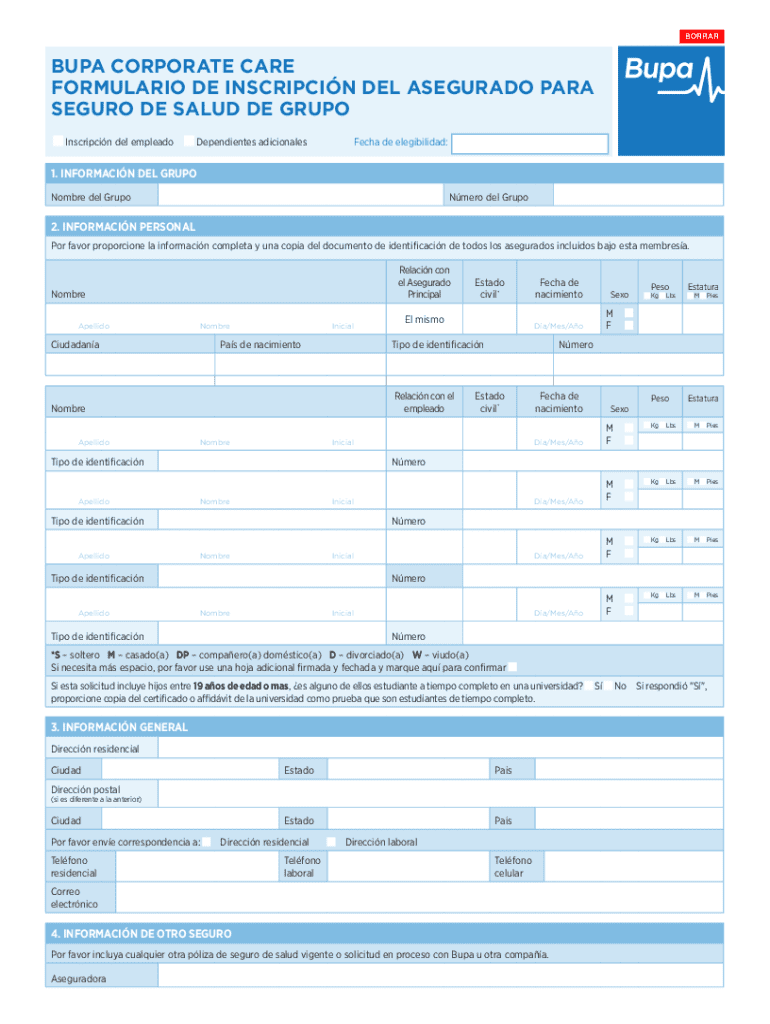 Características Clave del Formulario de Inscripción en el Seguro de Salud del Grupo Corporativo Bupa