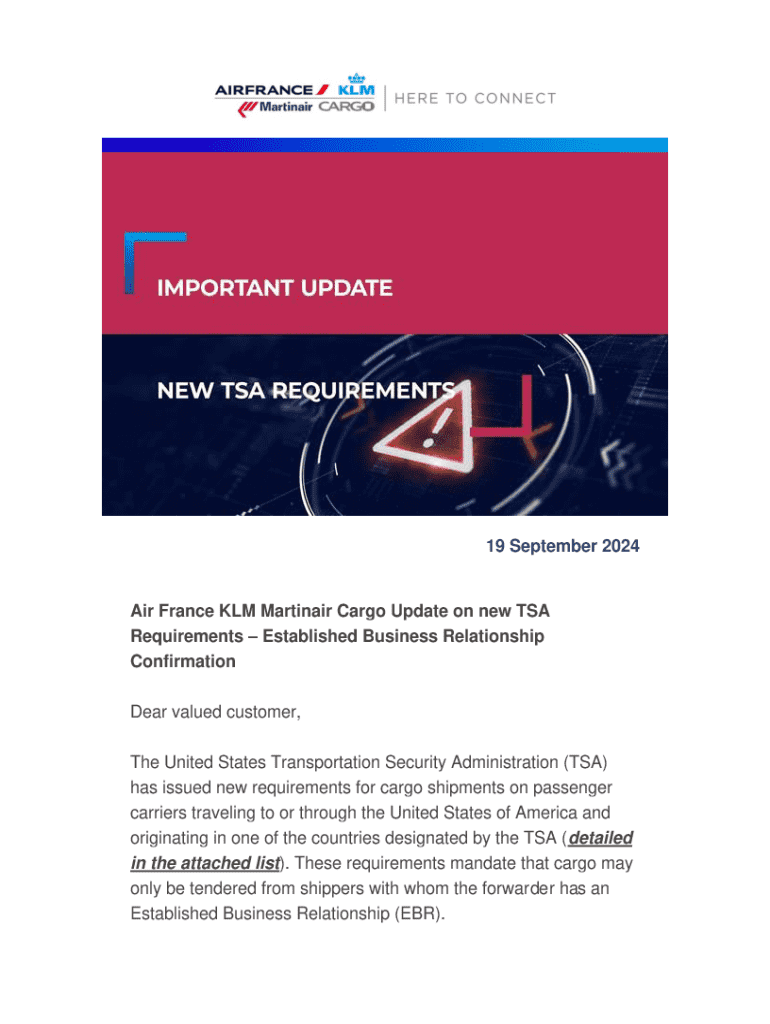 To avoid shipment refusals, the TSA Established Business Relationship Confirmation must be signed and submitted by freight forwarders starting from September 23, 2024.