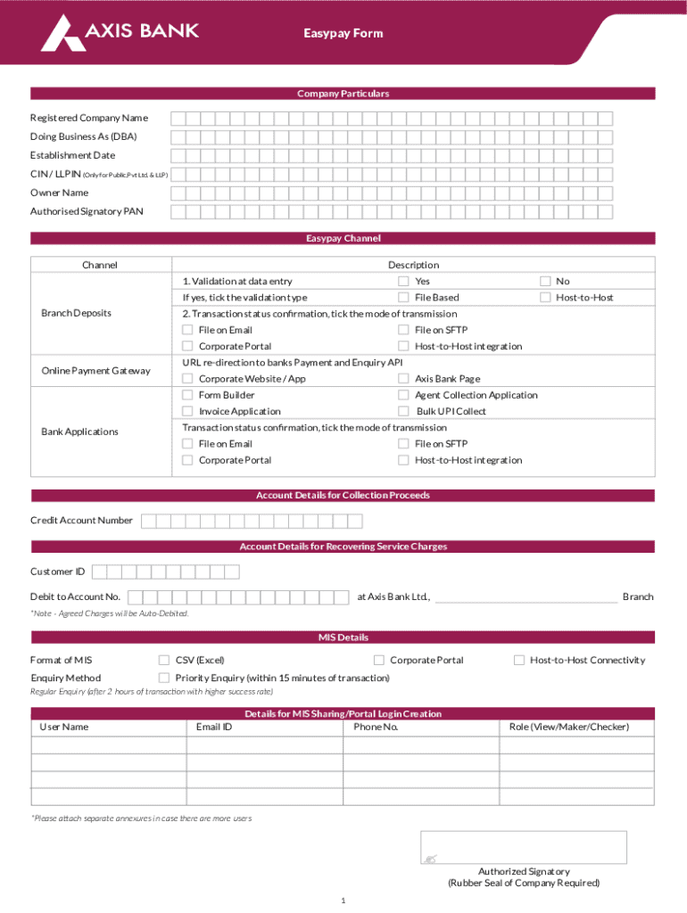 The Axis Bank Easypay Form is a financial document used by businesses to set up and manage payment collection services through Axis Bank.