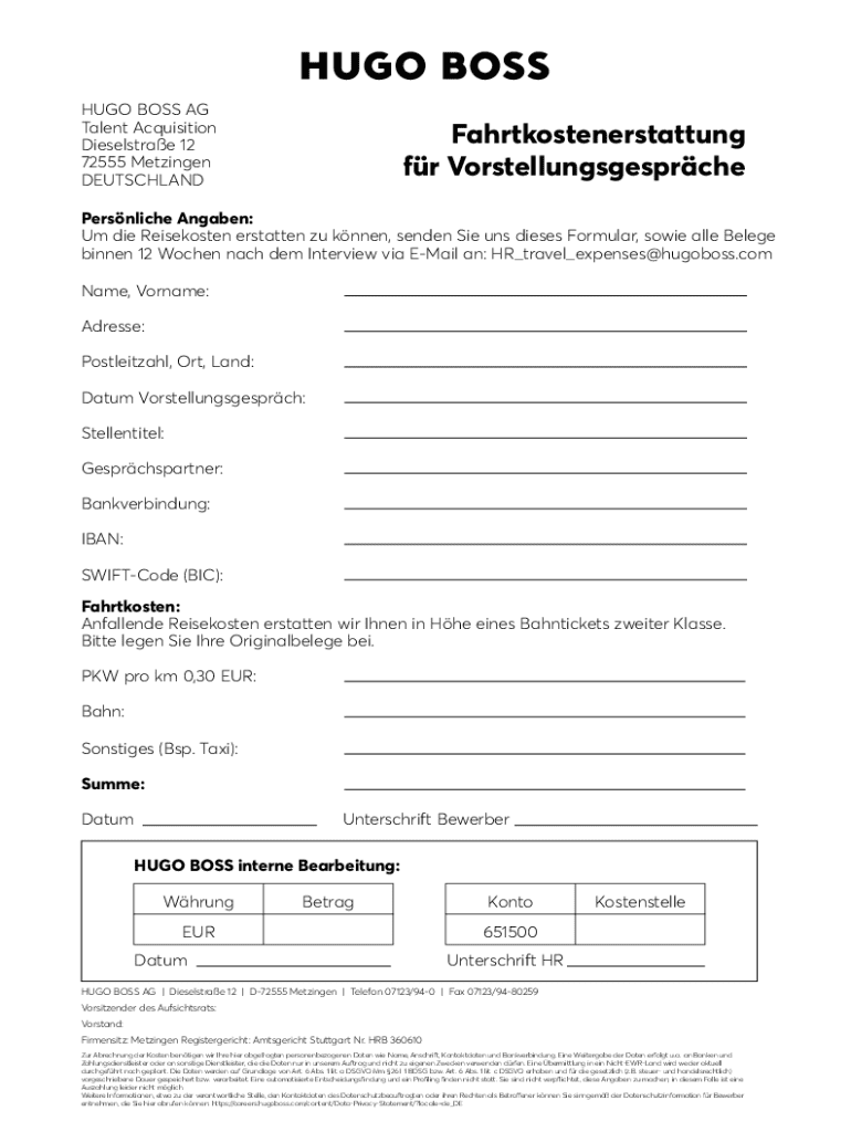 Das HUGO BOSS Reisekostenrückerstattungsformular ist ein Dokument, das von Bewerbern verwendet wird, um eine Rückerstattung für während Vorstellungsgesprächen entstandene Reisekosten zu beantragen.