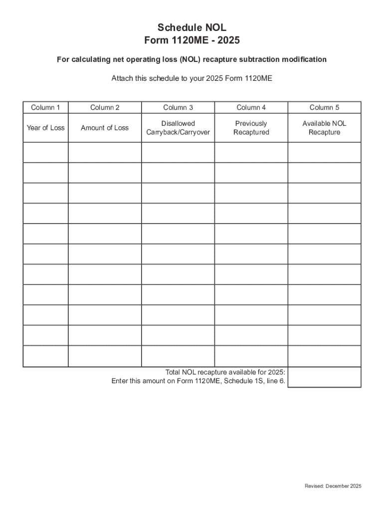 The Schedule NOL Form 1120ME 2025 is a crucial tax document for Maine residents designed specifically to calculate net operating loss (NOL) recapture. This form plays an essential role in relation to the main 2025 Form 1120ME, facilitating accurate reporting of financial losses carried over from previous tax years. Taxpayers must provide specific information, including the year of loss and associated amounts, to ensure compliance with Maine tax regulations.